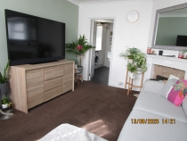 Feature fireplace and mantle piece, 1 wall mounted radiato, Carpeted floor, 1 large front facing UPVC window, door providing access to rear kitchen