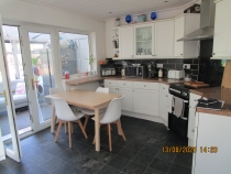 Range of wall and base white country style fitted units and cupboards, black slate tile affect floor, complimentary worktops incorporating sink and drainer unit, freestanding electric cooker with 4 hobs, large extractor over, plumbing for washing machine and freestanding fridge\freezer, double glazed double window to side. and double upvc interlocking patio doors providing access to