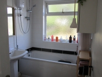 Three piece suite comprising bath with electric shower unit over and tiled surround, light oak grey lamiante affect lino floor, wash hand basin, WC, wall mounted radiator and double glazed obscure window to rear. storage cupboard housing combi gas boiler.