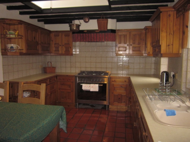 Spacious fitted Kitchen with tiled floor and a range of units and large freestanding double cooker and Hob along with washing machine. Dining area with table and chairs