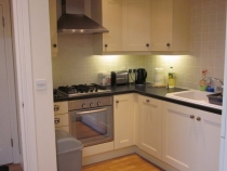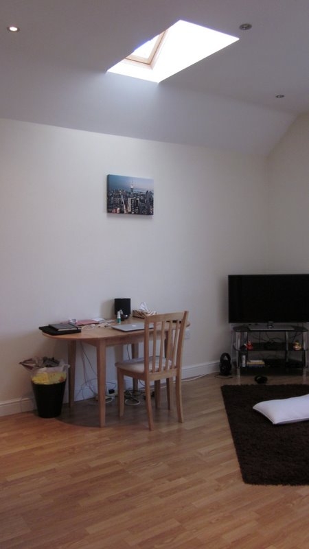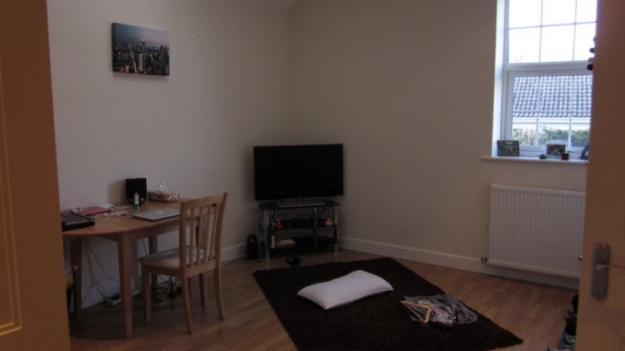 Open plan Lounge with Kitchen to side, Wall mounted telephone main door entry security system. 1 double glazed window with front aspect and additional light via velux windows, 1 wall mounted radiator, Infra red alarm sensor Laminate floor. Door providing access to double bedroom