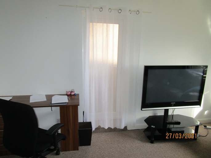1 Large Double glazed window to the rear aspect with nice views, 1 wall mounted storage heater with feature fireplace and electric fire, Carpeted floor and Double glazed door leading to shared balcony with nice views.
