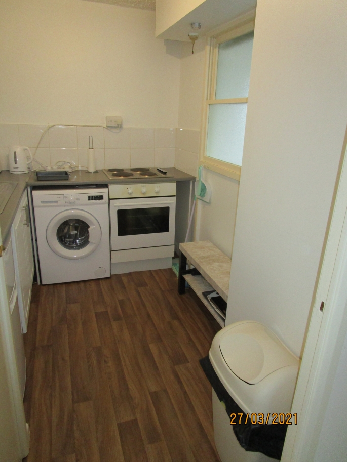 Range of wall and base units and cupboards, complimentary worktops incorporating sink and drainer unit, Freestanding electric oven and 4 plate hob with extractor over, washing machine, part tiled walls with serving hatch overlooking the lounge.
