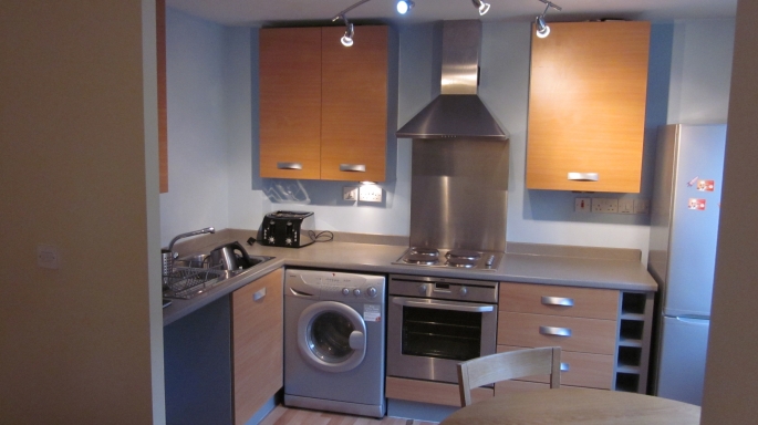 Large open plan Kitchen & Lounge with hard wearing lamiante effect flooring throughtout. Kitchen area having it's own alcove providing enough space for a large table and chairs, kitchen area with a range of wall and base units and cupboards, complimentary worktops incorporating sink and drainer unit, Electric Hob and built in oven with extractor over, plumbing for washing machine, wall mounted progamable electric heater, double glazed window overlooking front.