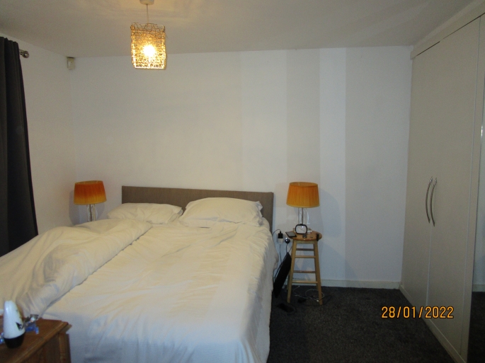 Spacious bedroom with large area behind the door for a large wardrobe. Carpeted floor with wall mounted electric programmable heater. 1 Upvc double glazed window.
