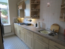 Large galley style Kitchen with hard wearing linoluem flooring throughout. Kitchen area providing enough space for a table and chairs, comprising a range of wall and base units and cupboards, complimentary worktops incorporating sink and drainer unit, Gas Hob with Extractor over and seperate built in oven, Dishwasher, Washing machine, wall mounted radiaror, double glazed window overlooking side garden.