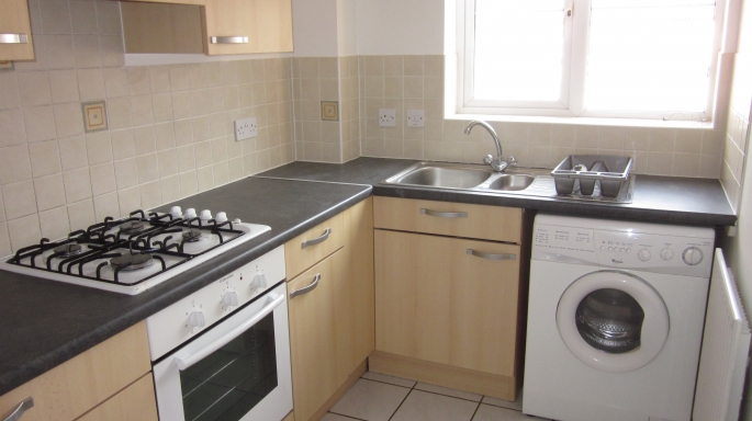 Range of wall and base units and cupboards, complimentary worktops incorporating sink and drainer unit, Built in electric oven and 4 burner gas hob with extractor over, plumbing for washing machine, wall mounted radiator, double glazed window overlooking front.