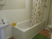 Modern Three piece suite comprising bath with shower comprising seperate temperature control mixer unit with tiled surround, wash hand basin, WC. Wall mounted silver heater towel rail\ radiator and large extractor fitted above the shower.