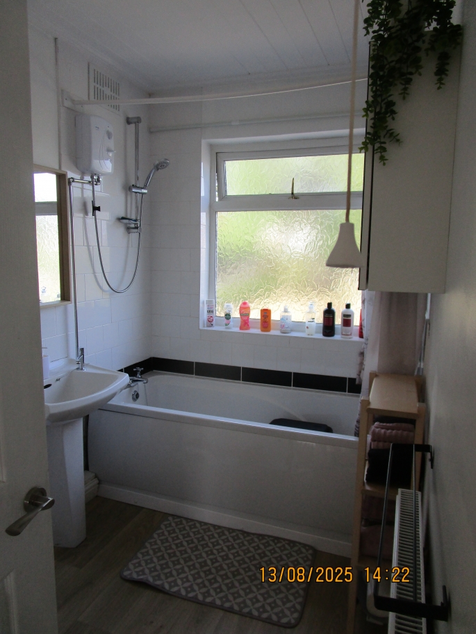 Three piece suite comprising bath with electric shower unit over and tiled surround, light oak grey lamiante affect lino floor, wash hand basin, WC, wall mounted radiator and double glazed obscure window to rear. storage cupboard housing combi gas boiler.