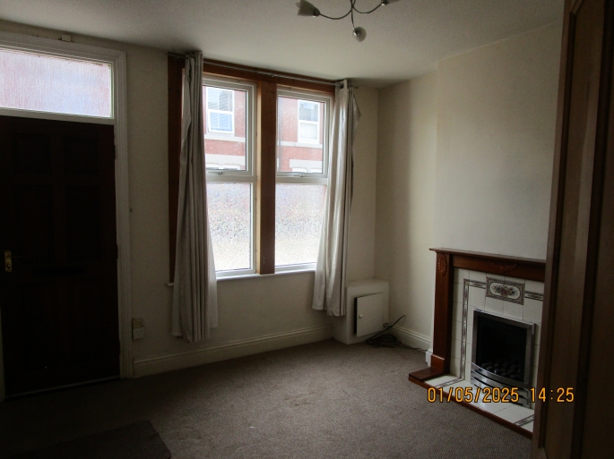 Timber front door providing access to spacious room which is fully carpeted with feature fireplace, wall mounted radiator and two UPVC glazed windows.