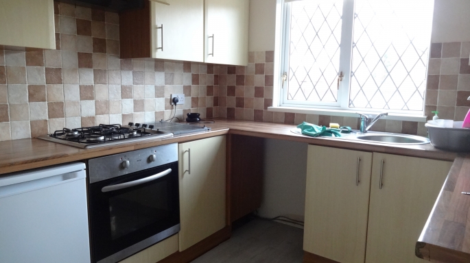 Range of wall and base units and cupboards, complimentary worktops incorporating sink and drainer unit, built in electric oven with 4 burner gas hob with large extractor over, plumbing for washing machine and under the counter fridge, double glazed double window overlooking he front garden. Timber effect laminate floor- providing access to