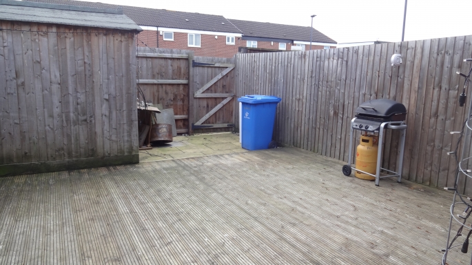 low maintenance decked area. Garden outbuilding at end of garden. Rear gate leading to path and parking area to rear of the property.